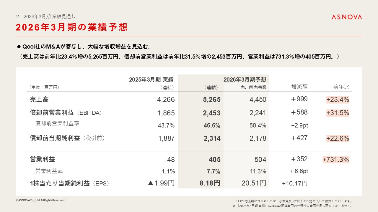 今期の業績予想につきましては、Qool社のM&Aが寄与し、大幅な増収増益を見込んでおります。