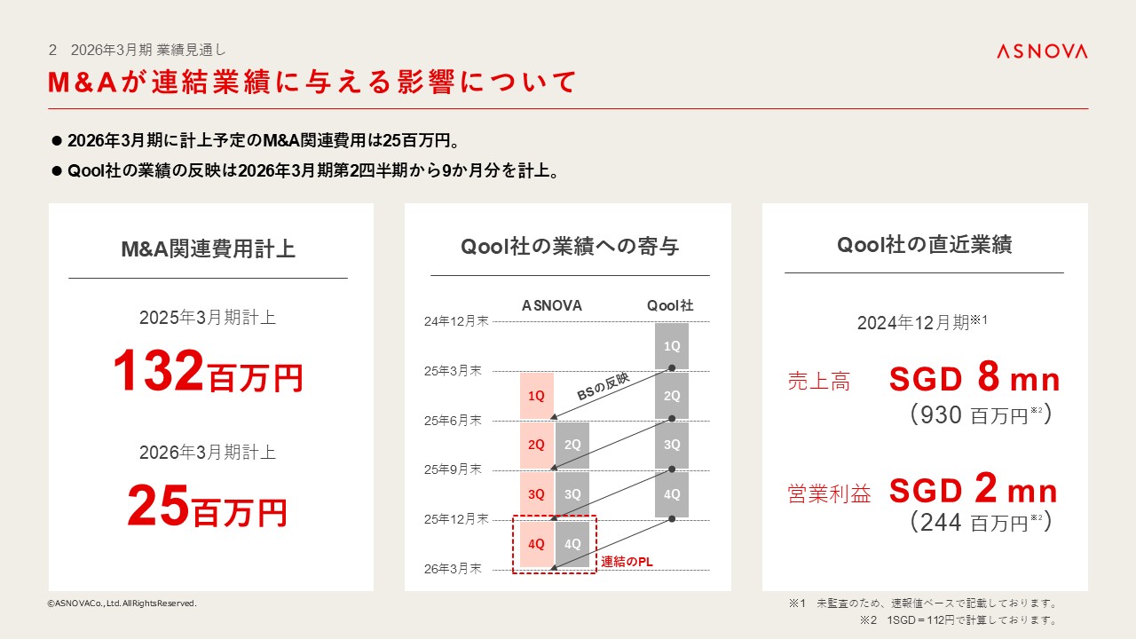 2026年3月期に計上予定のM&A関連費用は25百万円となります。そしてQool社の業績への寄与は、2026年3月期第2四半期からとなり、Qool社の4月から12月までの9か月分の業績が連結業績に寄与されてまいります。