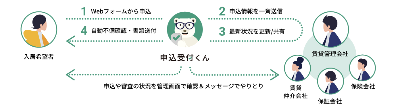 入居希望者がWeb上で入力した申込に必要な情報や申込手続きの進捗を、賃貸不動産管理会社、賃貸不動産仲介会社、家賃債務保証会社、保険会社などに連携し、申込書提出から審査までのやりとりを効率化することができる、仲介会社利用率94.5%(※2)の賃貸住宅の入居申込受付システムです。現在、「申込受付くん」による賃貸物件電子入居申込数は年間100万件以上(※3)で、約3,000社で導⼊(※4)、国内約88社の保証会社と連携(※4)しています。