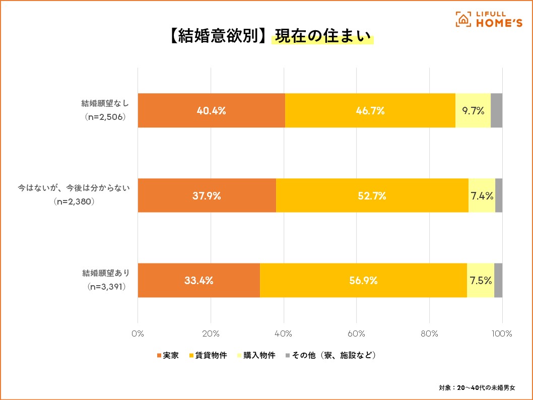1都3県在住の20~40代未婚男女を対象にしたインターネットアンケートで、結婚願望と今の住まいについて聞いたところ、「実家暮らし」の割合が結婚願望なしが最も高く(40.4%)、結婚願望あり(33.4%)と約7ptの差異が出ました。また、「購入物件」の割合も結婚願望なしが最も高かった(9.7%)一方で、結婚願望ありの人でも7.5%いることが分かりました。