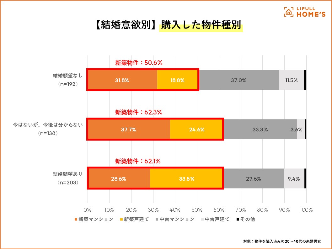 また、結婚願望ありと比べて結婚願望なしの人は新築物件の割合が低くなりました。結婚願望ありの人は、将来的に家族が増えることを見越して長く安心して住める新築物件を選ぶ傾向、反対に結婚願望なしの人は立地やコストパフォーマンス(合理性)を重視していることがうかがえます。