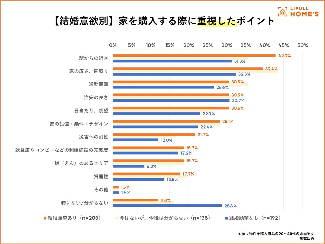 既に物件を購入している人に対し重視したポイントを聞いたところ、「特にない/分からない」と回答した割合が結婚願望ありは11.8%だったのに対し、結婚願望なしは28.6%にも上りました。全体的に各項目に対する選択割合も結婚願望ありの方が多く、結婚意欲のある人の方が家に対するこだわりが強いことがうかがえました。
