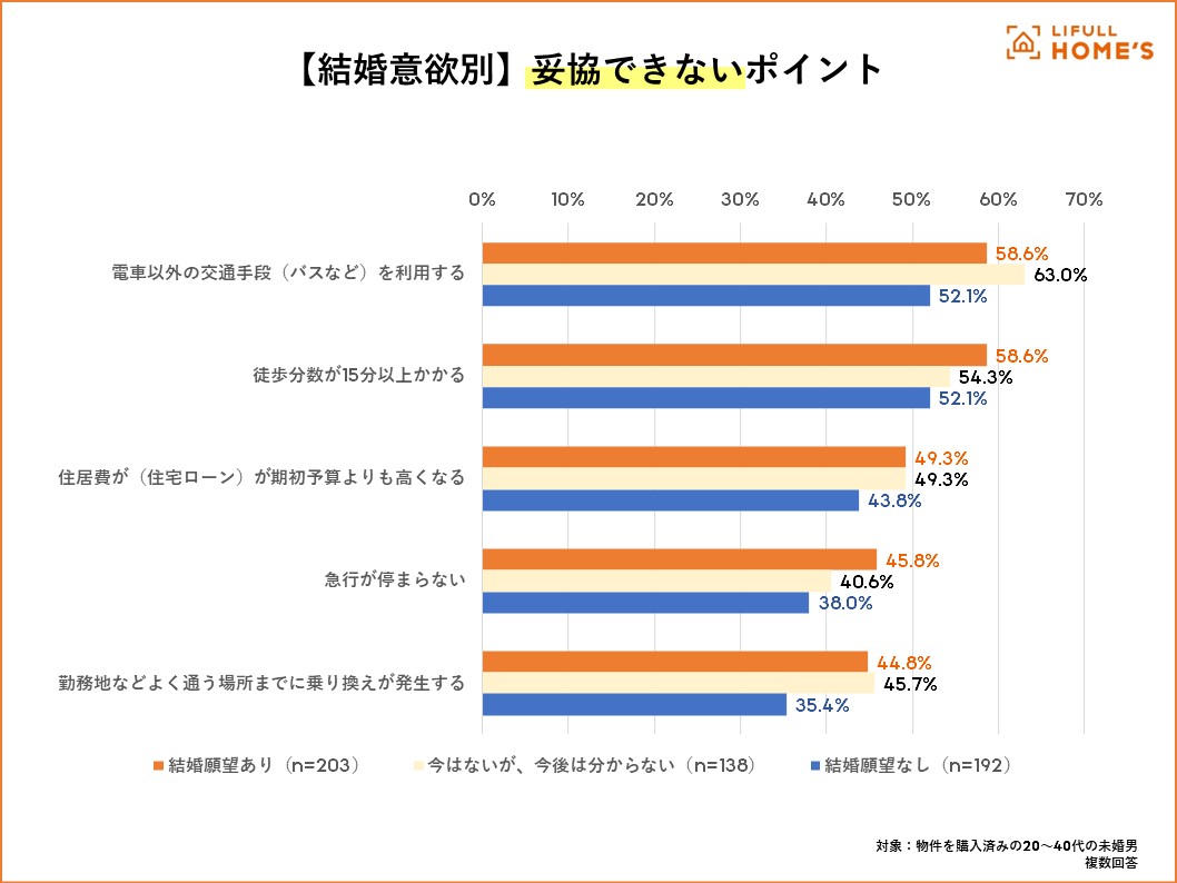 既に物件を購入している人に対し妥協できないポイントについて聞いたところ、結婚願望の有無に関わらず「電車以外の交通手段(バスなど)を利用する」「徒歩分数が15分以上かかる」(結婚願望あり:58.6%、結婚願望なし:52.1%)が最多となりました。
