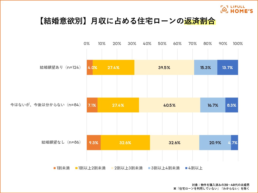 既に物件を購入している人に対し、「月収のうち住宅ローンの返済がどの程度を占めているか」を聞いたところ、結婚ありだと「2割以上3割未満」が最も多くなったのに対し、結婚願望なしでは「1割以上2割未満」が同率となりました。「1割未満」の回答割合も結婚願望なしの人の方が多く、反対に「4割以上」と回答した人は結婚願望無しが4.7%だったのに対し、結婚願望ありが13.7%と乖離がみられました。