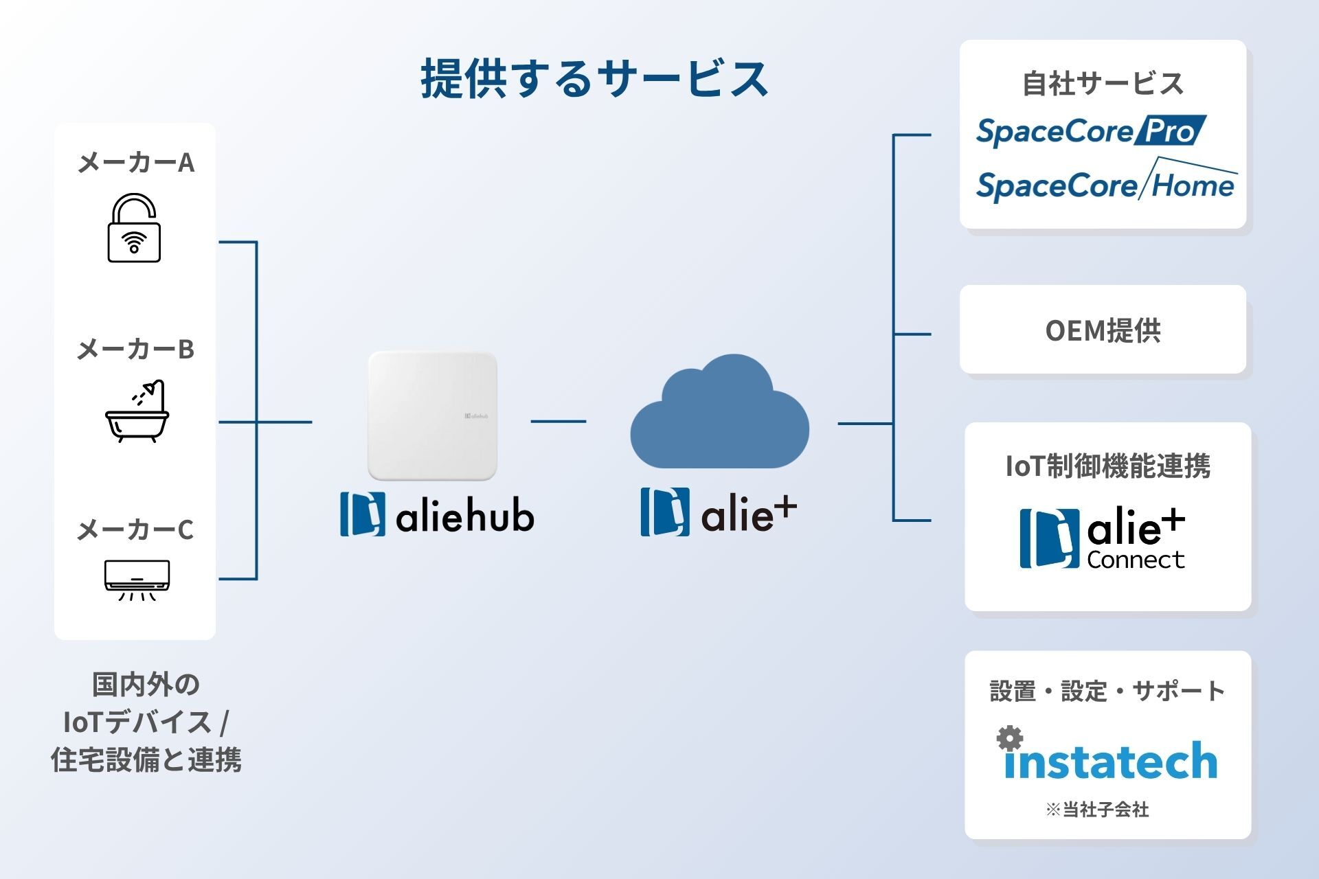 自社開発のIoTプラットフォーム「alie+(アリープラス)」をベースにスマートホームプロダクト「SpaceCore(スペースコア)」を提供 しています。また、alie+Connectを通じ、様々な業界に当社のIoTを提供しています。