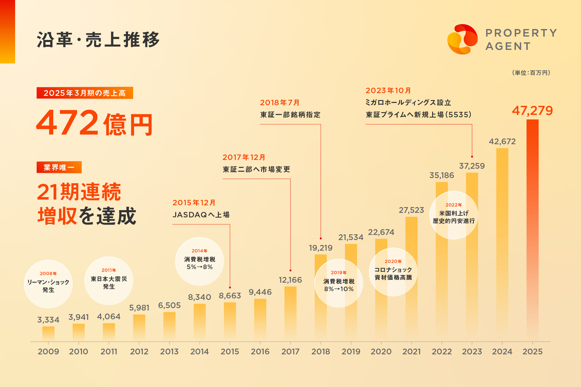 2004年の創業以来、21期連続での増収を達成することができました。リーマンショックや東日本大震災、コロナウィルスの影響を最小限に抑え、ビジネスを継続して成長させることができたのは、PAを選んでくださるお客さまがいたからに他なりません。
