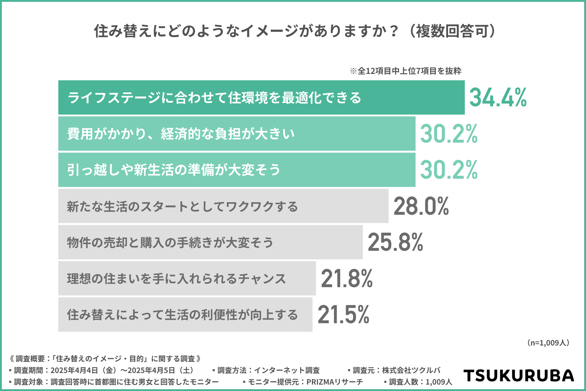 「住み替え(持ち家を売却して新居を購入)にどのようなイメージがあるか」を尋ねたところ、『ライフステージに合わせて住環境を最適化できる(34.4%)』が最多で、『費用がかかり、経済的な負担が大きい(30.2%)』『引っ越しや新生活の準備が大変そう(30.2%)』が続く結果となりました。
