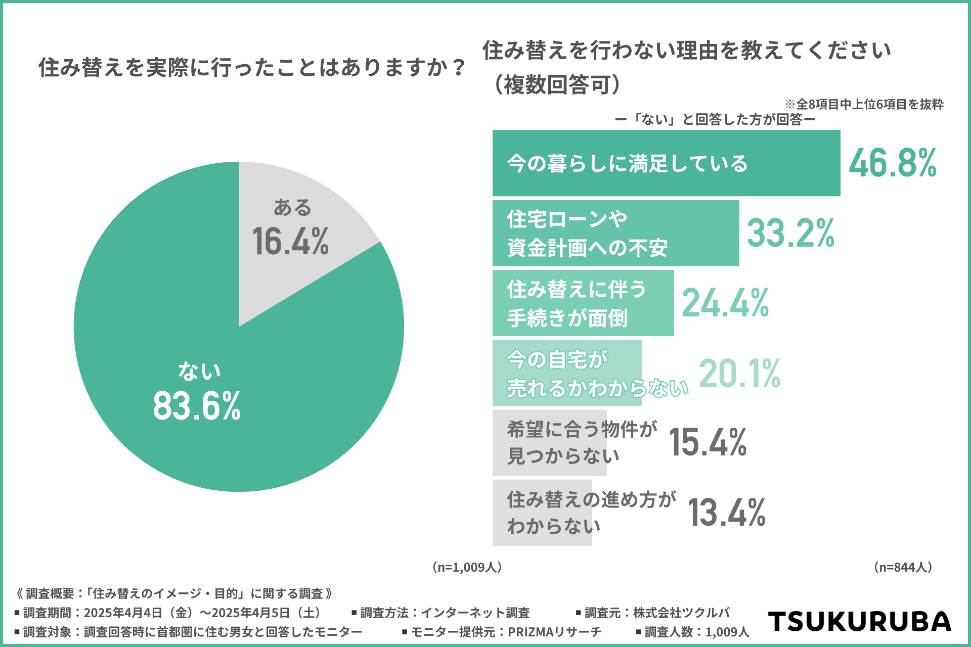 前の質問で『ない』と回答した方に、「住み替え(持ち家を売却して新居を購入)を行わない理由」について尋ねたところ、『今の暮らしに満足している(46.8%)』が最多で、『住宅ローンや資金計画への不安(33.2%)』『住み替えに伴う手続きが面倒(24.4%)』が続く結果となりました。