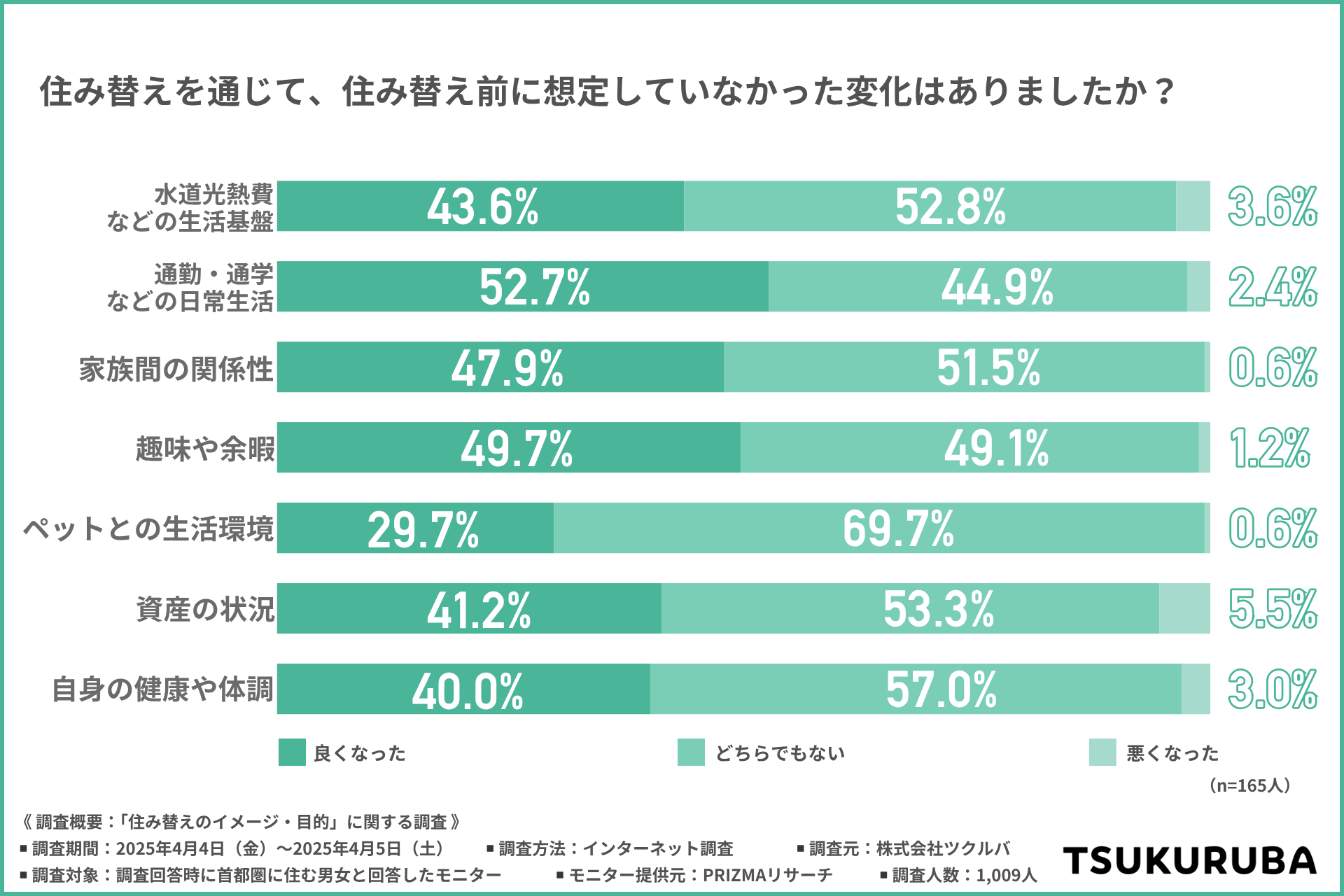 「住み替え(持ち家を売却して新居を購入)前に想定していなかった変化」について尋ねたところ、上のグラフのような回答結果になりました。