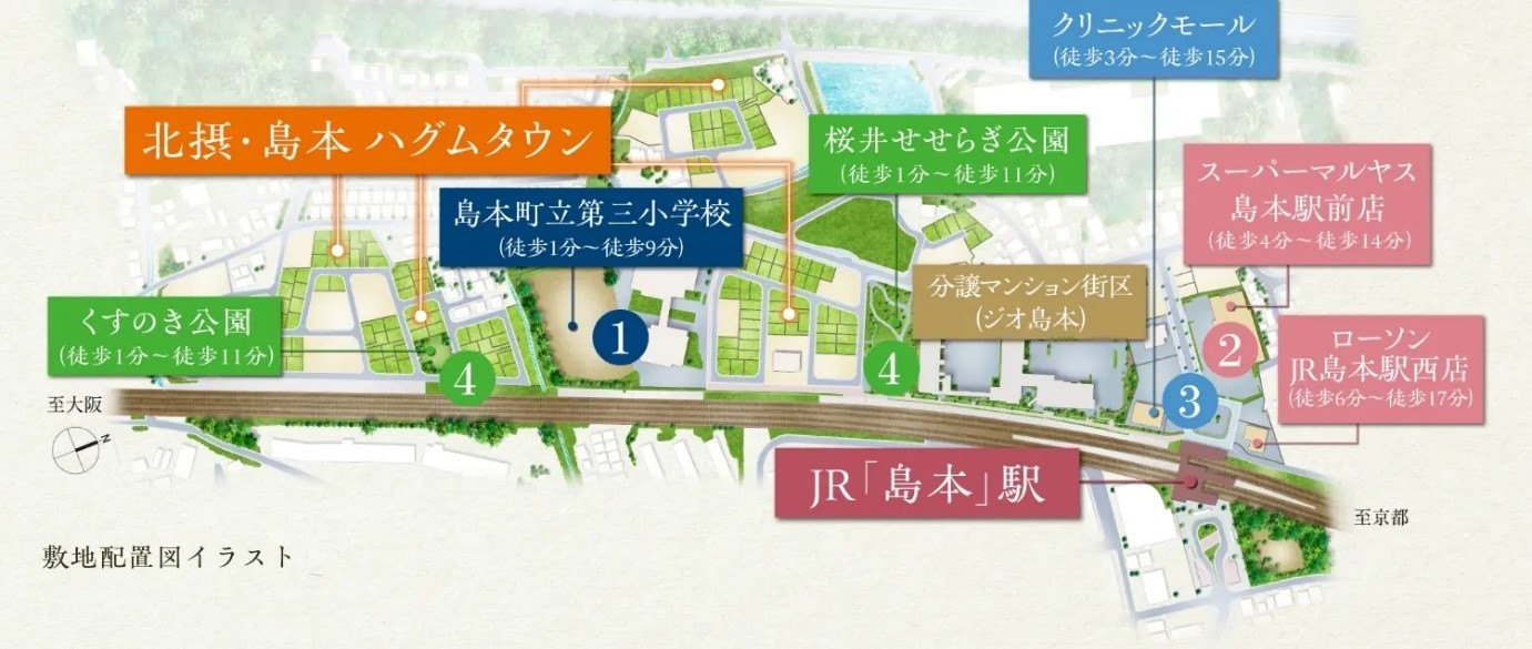 当エリアは、島本町JR島本駅西地区土地区画整理組合による土地区画整理事業により、分譲マンション・分譲戸建住宅・商業施設・医療施設などを含む複合開発が進められている新たな居住エリアです。