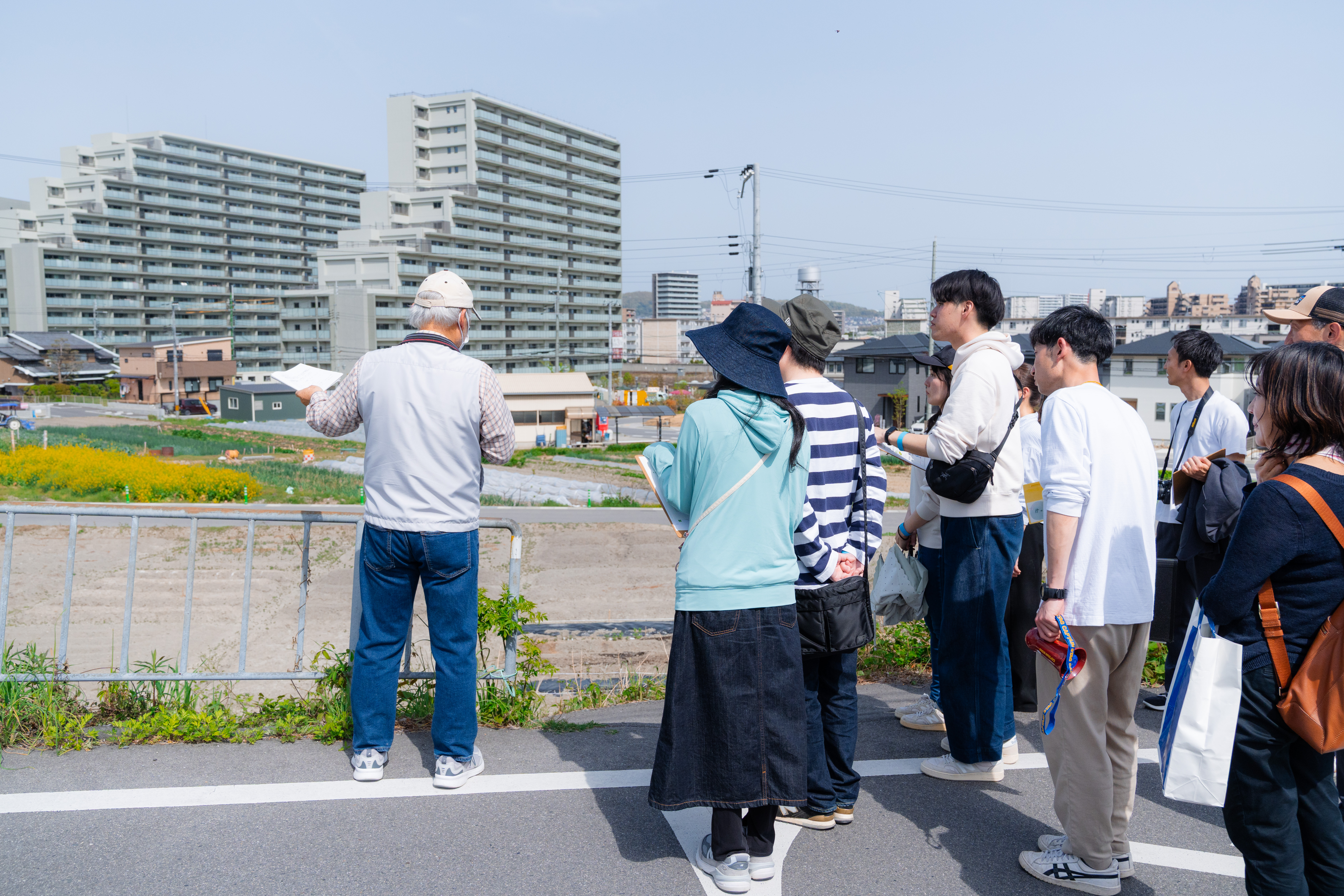 ツアーでは、桜井せせらぎ公園の地下に設置された調整池の役割や、地名の由来、島本町の歴史について学びました。ガイドからの島本町の歴史に耳を傾けながら歩く中で、新たに島本町に住まう参加者と、もともと島本町に暮らす方々とが「島本町」という共通のテーマをきっかけに、自然と会話を交わし、交流のきっかけを育むひとときとなりました。