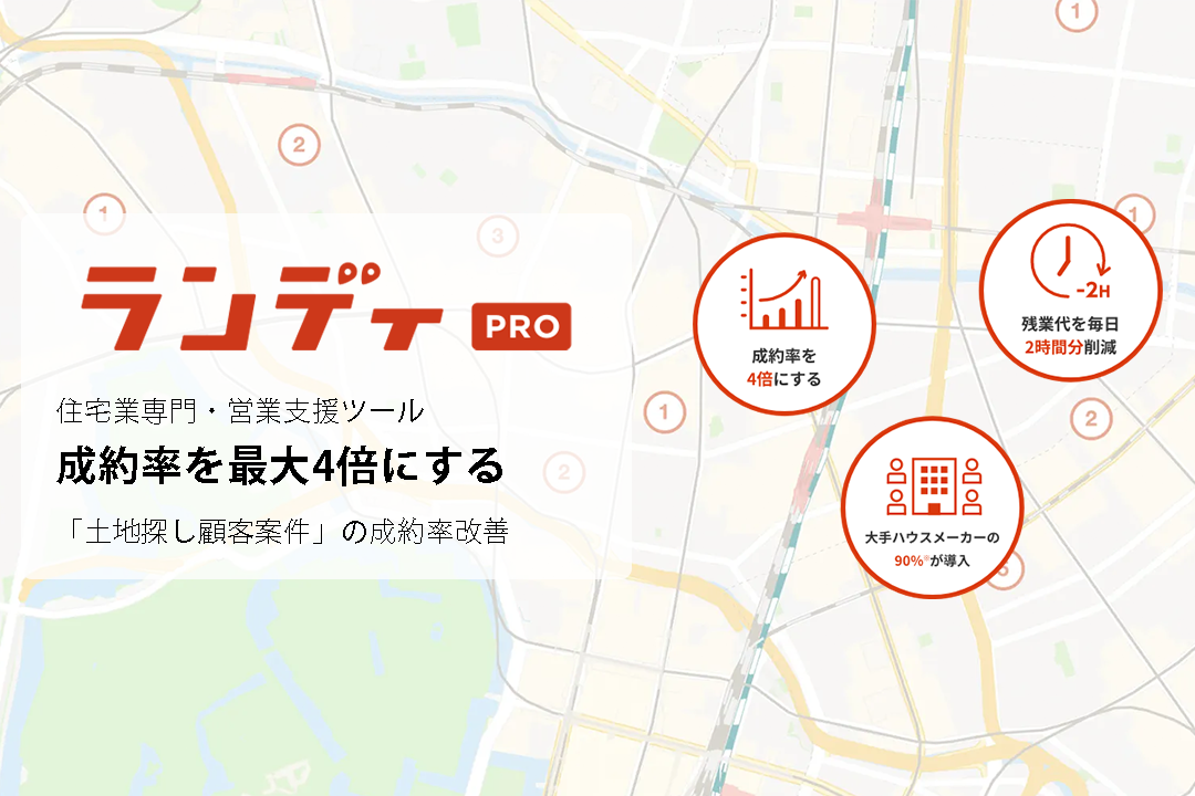 ランディPROは、大手ハウスメーカーの100%が導入している”建築会社の営業担当者向け、土地探し顧客の接客・追客支援をするSaaS型土地探しシステム” です。
