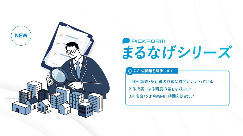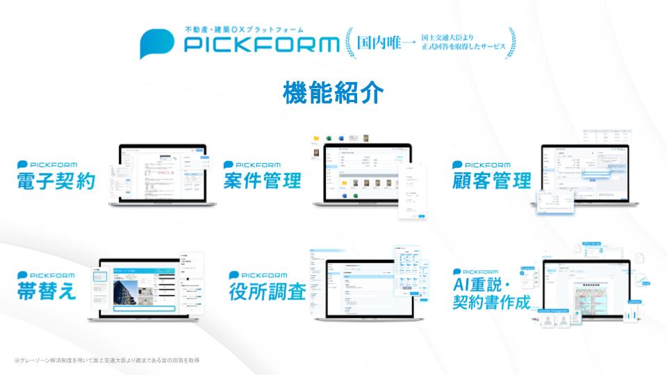 株式会社PICKは、「不動産取引を快適に、オープンに」をミッションに、不動産・建築業界のバリューチェーンが抱える構造的な課題に対し、2022年の「PICKFORM 電子契約」をリリース以来、不動産/建築の取引における「顧客体験の向上」を目指している企業です。「PICKFORM 電子契約」では国内で唯一国土交通大臣より正式回答をもらい、新しい法律に対しても安心して”適法に”利用いただけるサービスとして、導入企業が増えております。 今後は、不動産/建築業者の皆様の業務を1つでも多く解決するべく、業者の皆様の業務工程のあらゆるシーンにおけサービスのリリースを予定しています。PICKFORMは不動産・建築特化の Verticalオールインワン SaaSとして業界に貢献できるよう進化していきます。