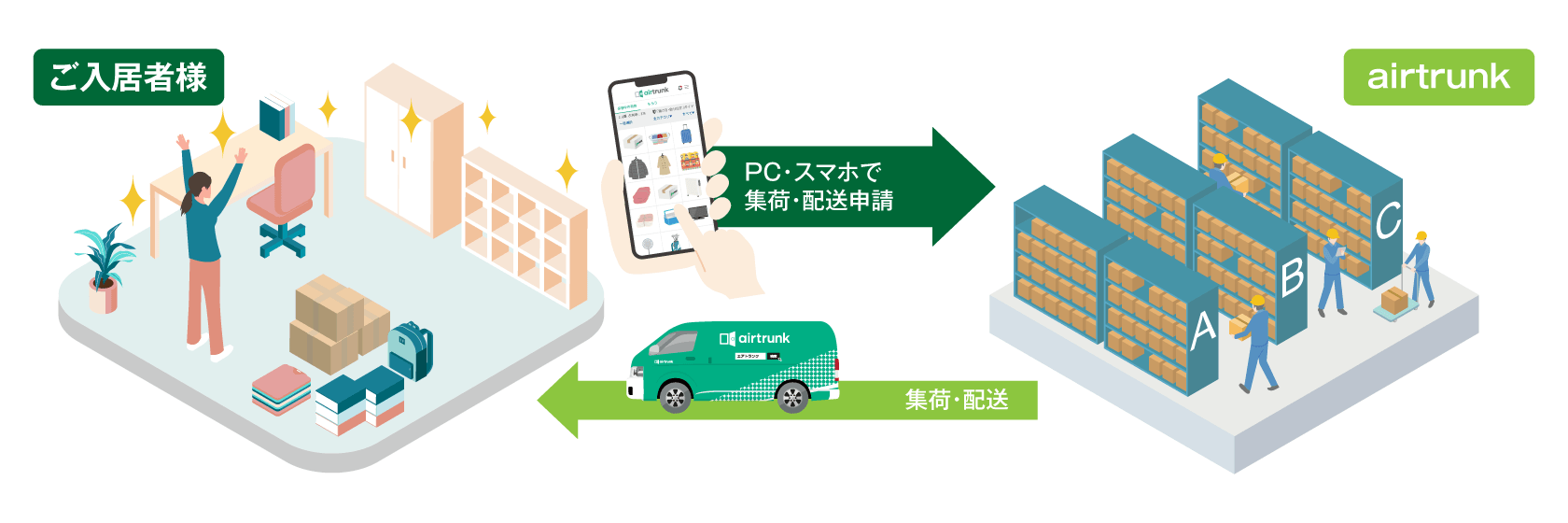 エアトランクは、“自宅の収納のような使い心地”を追求しております。お客様が自分で運搬し、お荷物の出し入れ作業を行う従来のトランクルームとは異なり、「サービスクリエーター」と呼ばれる専任のスタッフが集荷・配送を行い、お客様のお品物をお預かりします。