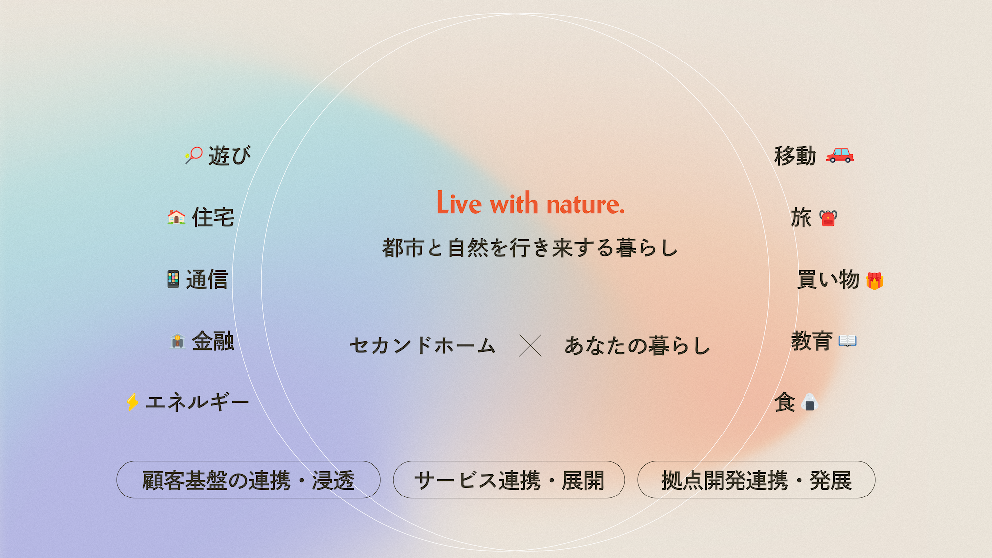 移動・住まい・商業・自然体験・金融など、暮らしの基盤を担う産業、そして日本各地の自然拠点や地域事業者も含めた連携を実現し、都市生活者が軽やかに都市と自然を行き来できる、次世代型ライフスタイルの仕組みを共創していきます。