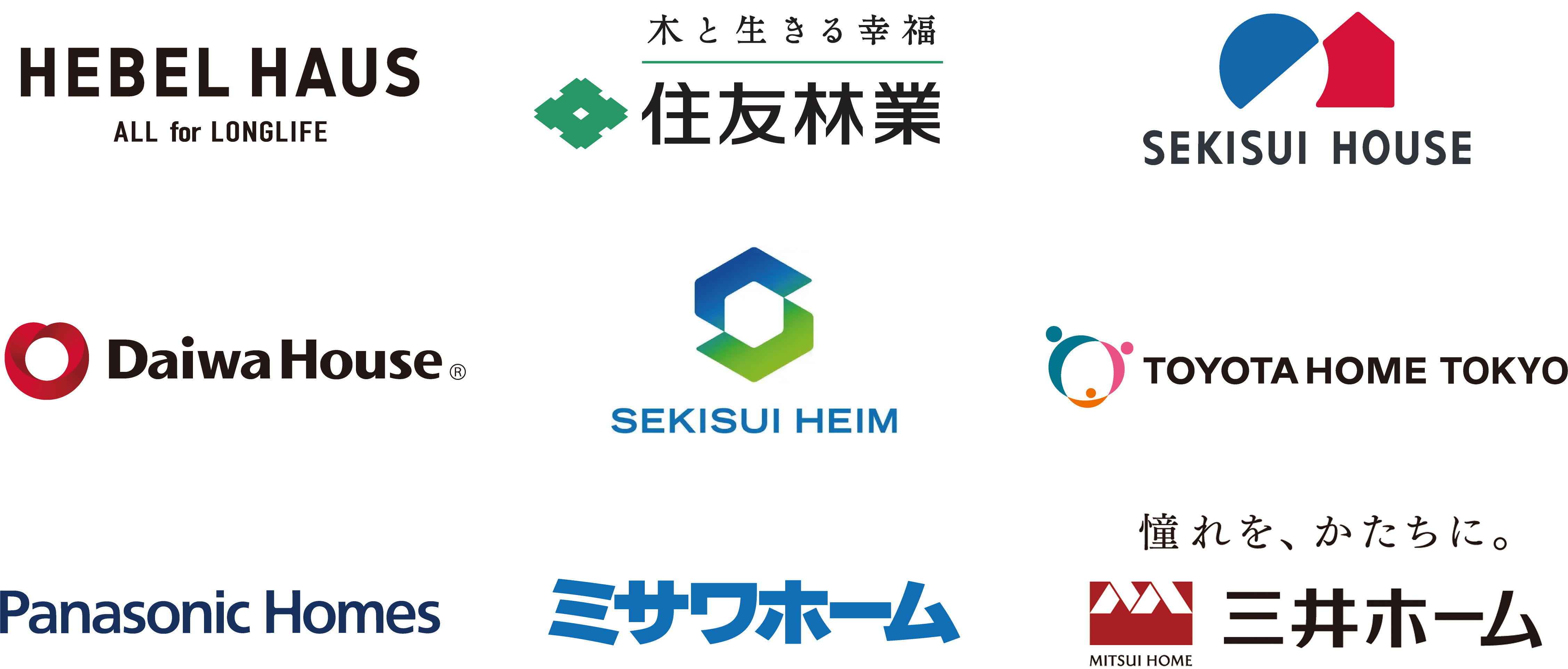 イエージェントは旭化成ホームズ株式会社(へーベルハウス)、住友林業株式会社、積水ハウス株式会社、大和ハウス工業株式会社、東京セキスイハイム株式会社、トヨタホーム東京株式会社、パナソニック ホームズ株式会社、ミサワホーム株式会社、三井ホーム株式会社の9社(五十音順)から協力いただき、合計1,000人以上の営業担当者の中から、お客様の希望に合う知識や経験を持つ担当者をつなぎ、お客様の「人生最大の買い物」のお手伝いをしてまいります。