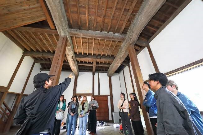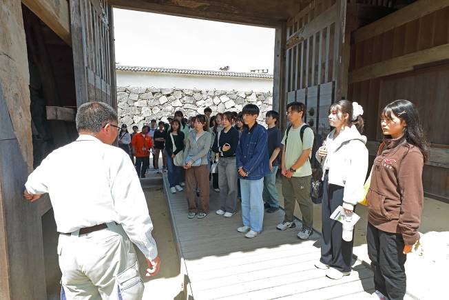 (伝)潮見櫓の清掃を終えると、今度は城内敷地の南に位置する国指定重要文化財の多聞櫓に移動し見学を行いました。多聞櫓は、「石落」や「鉄砲狭間」が備えられた櫓で、高く積み上げられた石垣を土台に築かれています。今回、16の小部屋に分かれている建物内部を特別に見学することができました。最後に職員の方から終了の挨拶があり、解散となりました。