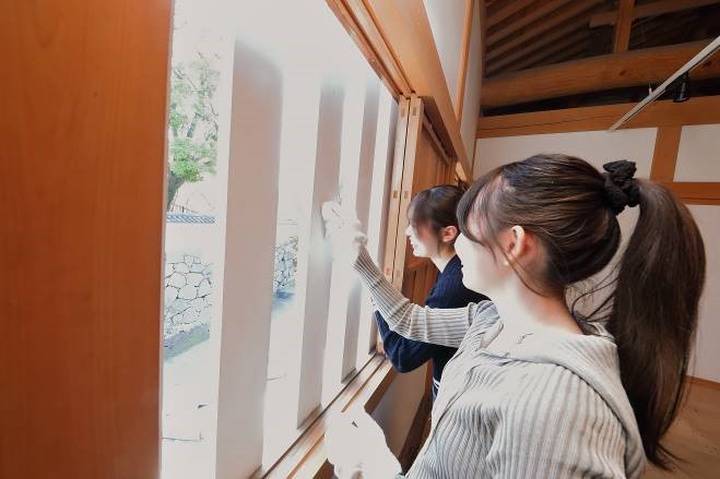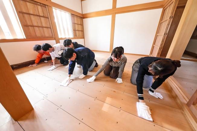 建物内では職員の方より、建物の歴史などの詳細と掃除の仕方について説明があり、作業を開始しました。2班に分かれ、それぞれの建物を担当します。ほうきや雑巾で床の汚れを取り、はたきで窓や壁の埃を落としていきます。建物の外では、周辺の雑草の抜き取り作業を行いました。参加者同士で出身地や学校のことなど、会話を交わしながら楽しそうに作業にあたっていきます。約40分間の作業を経て、随分と綺麗になりました。