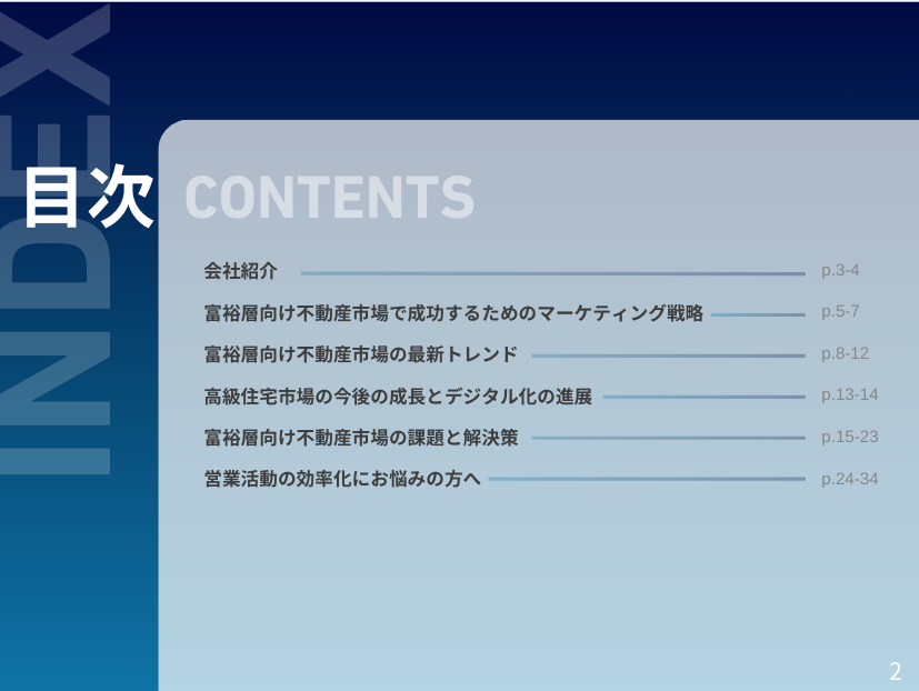 本レポートでは、富裕層向け不動産市場の最新トレンドや富裕層への効果的なアプローチ方法、デジタルマーケティングを活用した営業戦略について紹介しています。