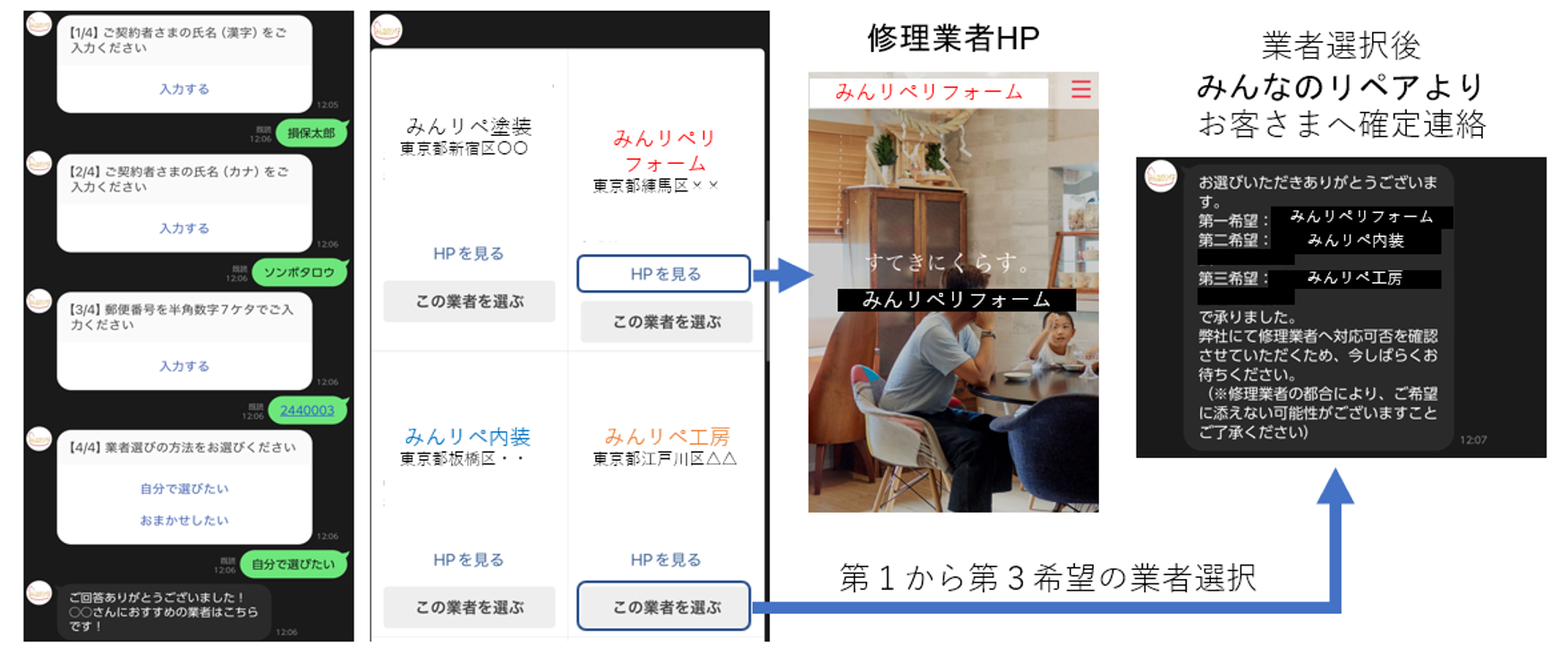 見積修繕プラットフォームは、建物修理業者の紹介を希望されるお客さまにLINEでリンクを送付し、リンク先のページにてお客さまに建物修理業者を選択いただく仕組みです。