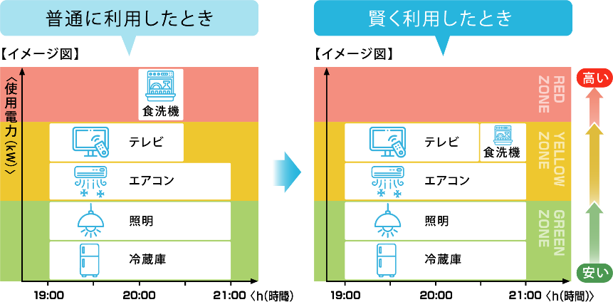 FNJ独自のデマンドレスポンス型電気料金プラン。30分単位の使用量に応じて料金単価を設定。家電の同時使用を抑える等、低い料金単価で収まるように使えば、電気料金の節約が可能※2。