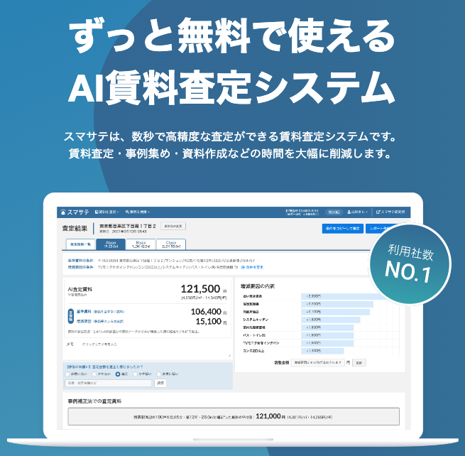 「スマサテ」は、数秒で高精度な査定ができる賃料査定システムです。賃料査定・事例集め・資料作成などの時間を大幅に削減します。