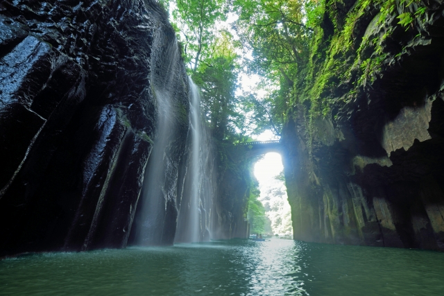 阿蘇山の火砕流が侵食されて断崖となった峡谷で、国の名勝・天然記念物に指定されています。高千穂峡では四季折々の景色が素晴らしく、 春から初夏にかけては、色とりどりの花が絶壁を彩り、 秋には紅葉が色づき、冬には氷が峡谷を覆 います。時期ごとに違った景色が魅力です。また、近隣の高千穂神社では、日本神話に登場する神々の物語を演じる「夜神楽」を 楽しむことができます。