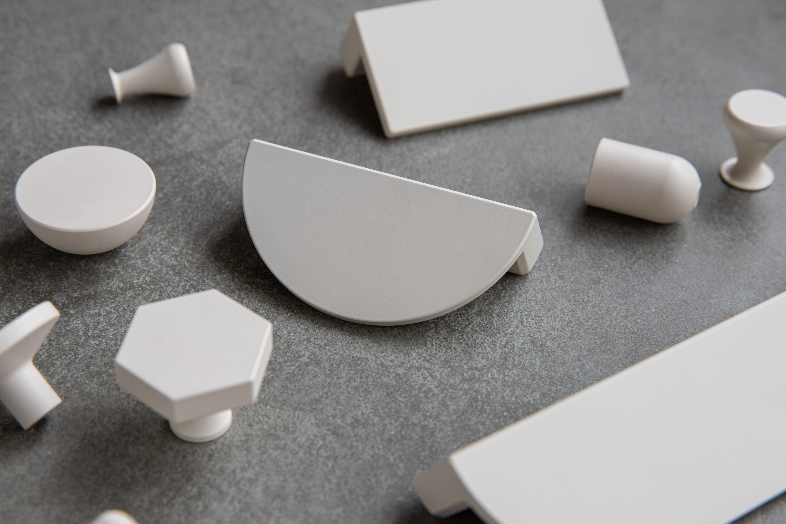 形は9種、サイズ展開も含めると全12種の展開。ドアや大きな収納扉に取り付けたり、キッチンのキャビネット、既製品の家具の引き出しに付けるといった取り入れ方もできます。家の各所のつまみや取っ手をシリーズで揃えることも可能です。