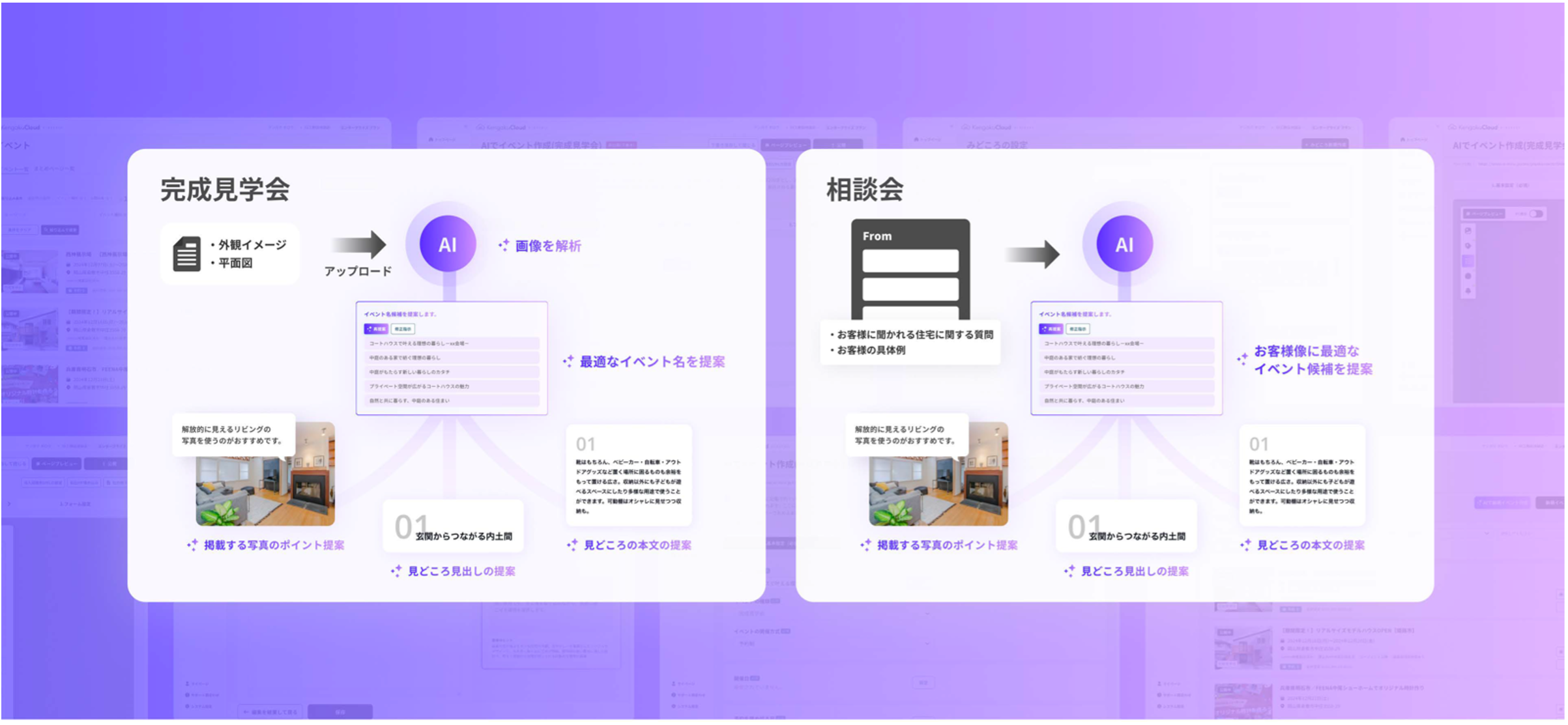 完成見学会と相談会、2種類のイベントページ作成をAIが提案します。手間に感じる方が多かったイベント名の入力や魅力を伝える文章を、AIが物件やお客様のイメージを分析し自動で提案してくれます。