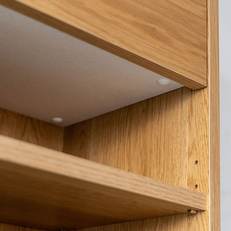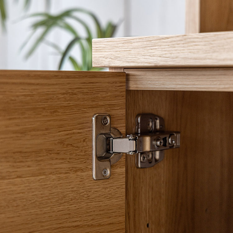 シトラスIIシリーズの特長は、何と言ってもオーク材の美しい木目とホワイトのバックパネルを組み合わせた、明るさと木の温もりを感じるデザイン。ホワイトを組み合わせることで、ナチュラルだけでなくモダンで洗練された雰囲気も演出します。取っ手部分は天然木のパーツを採用するなど細部までこだわり、木の優しい質感を感じられるように仕上げました。