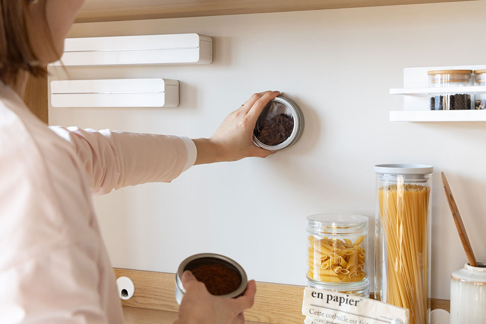 OPDB(1000/1200/1400)のバックパネル部分にはガルバリウム鋼板を採用。マグネットタイプの収納ラックやフックを使えば、スパイスなど調味料やキッチンツールをディスプレイするように収納して有効活用できます。マグネットで浮かせて収納すれば、カウンター掃除も簡単です。