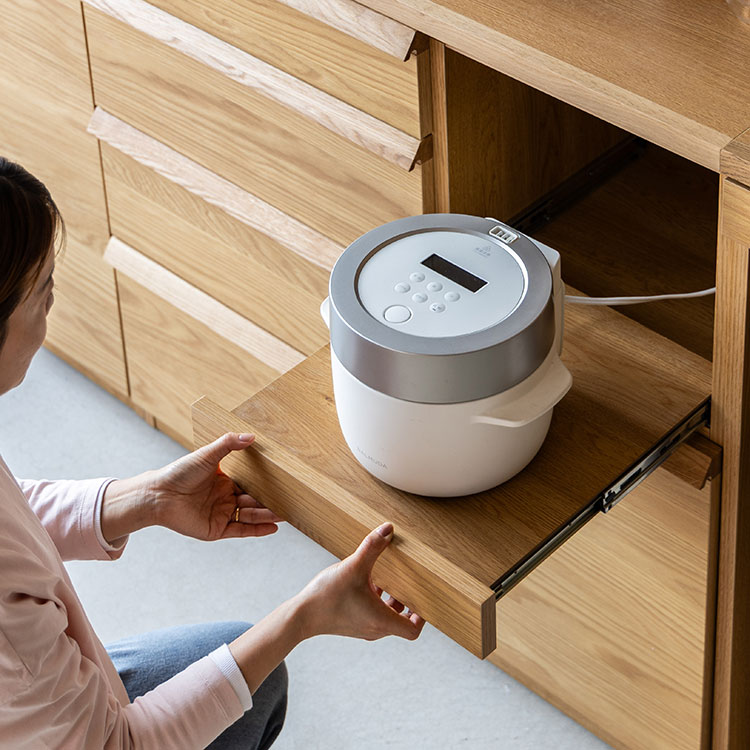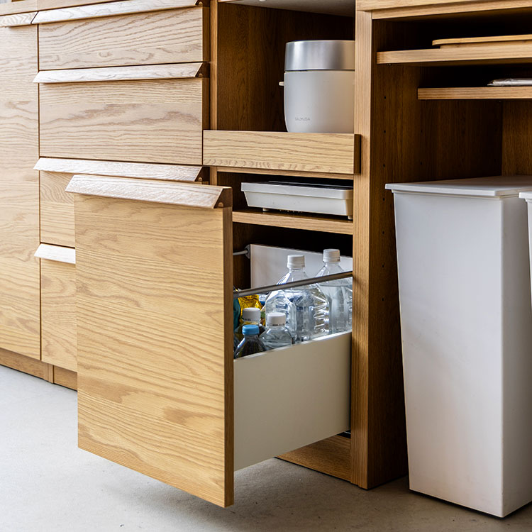 引出しは全部で5杯。フルオープン仕様で奥まで取り出しやすく、ソフトクロージング機能付きで指をはさむ危険がない安心設計。オープン収納下の引出しは深型にして飲料やキッチンペーパーなど高さのある日用品を収納できるようにしました。引出し上部に設置した棚は電磁調理器など低いものを収納できます。