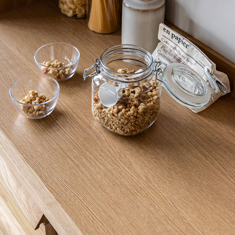 天板は傷や汚れ、熱に強いメラミン樹脂加工を施しているため、日常のお手入れもカンタン。汚れてもさっと落とせます。