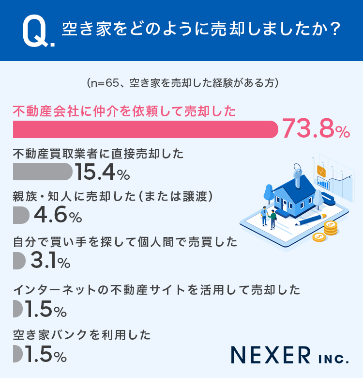 空き家を売却した経験がある方に調査してみたところ、73.8%が「不動産会社に仲介を依頼して売却した」ようです。