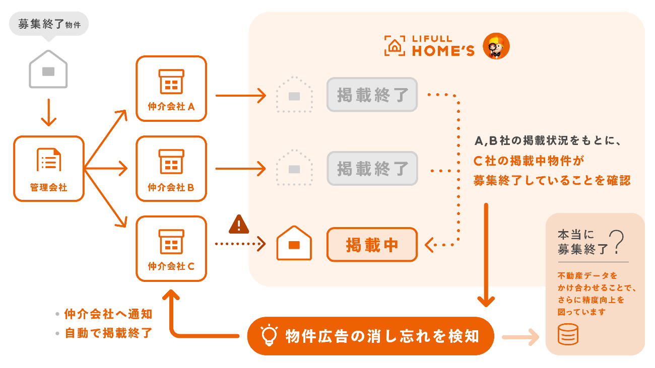 今回特許を取得した「メンテナンス見える化ツール」のほか、物件鮮度向上に向けて様々な取り組みを行っています。例を挙げると、当社の取り組みにご賛同いただいた25社の管理会社数が管理する約218万戸(2025年5月現在)の募集終了物件をLIFULL HOME’Sの掲載中の物件と照合し非掲載処理を行う仕組みを稼働しており、こちらも特許を取得しています。
