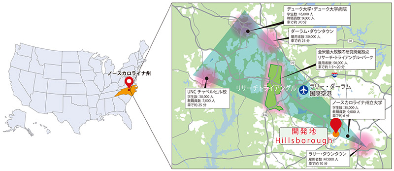 本物件はアメリカ東海岸の中心部に位置するノースカロライナ州の州都ラリー市に立地しています。ラリー市は首都ワシントンD.C.と南部の大都市アトランタを結ぶ州間高速道路(I-85)に近接しているため交通の利便性が高く、ノースカロライナ州立大学、デューク大学、ノースカロライナ大学チャペルヒル校を結ぶ教育と研究の一大拠点として知られる三角地帯「リサーチトライアングル」の中心に位置しています。また、300社以上の企業が集積するビジネス環境が形成されており、競争力のある人材を雇用可能な環境を背景に、安定した経済成長が期待できます。