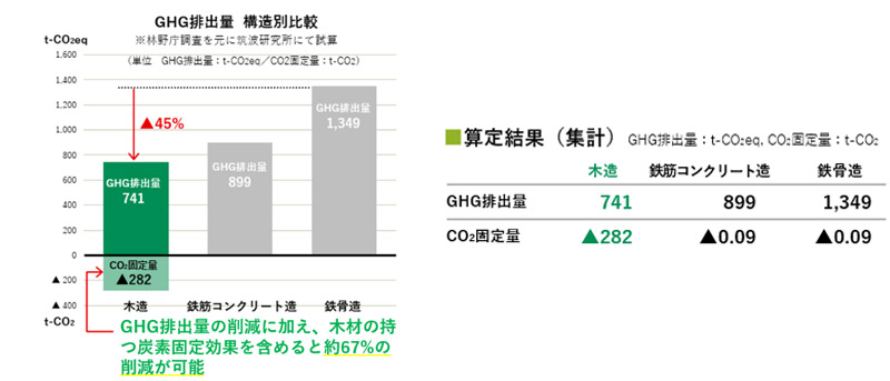 ※3. 林野庁調査をもとに住友林業の筑波研究所で試算(以下のグラフと表を参照)。林野庁「平成27年度 木材利用推進・省エネ省CO2実証業務 報告書」の資材数量をもとに3階建て事務所(1,500㎡)の躯体、外部、内部(設備除く)を対象として、新築時から解体時までのライフサイクル全体を対象として算定。
