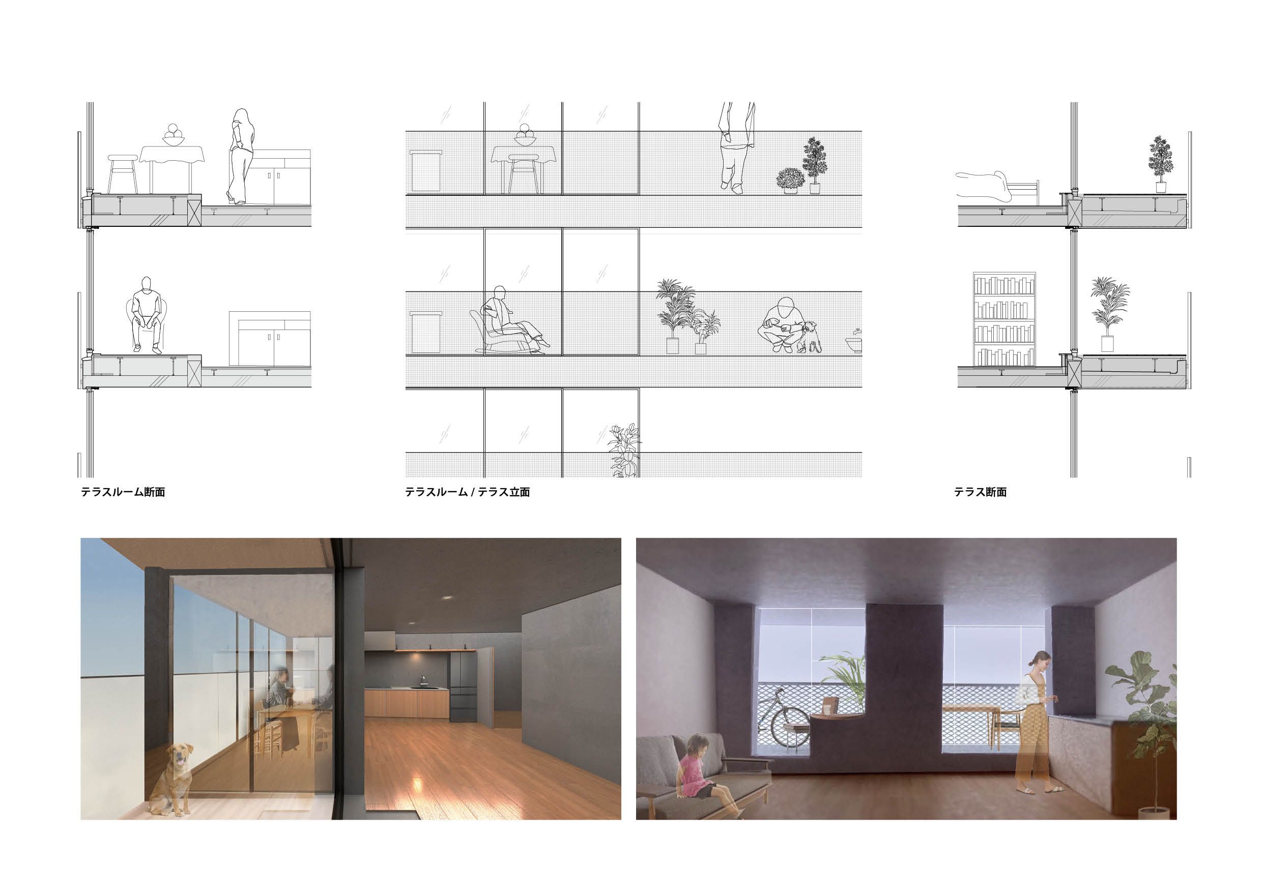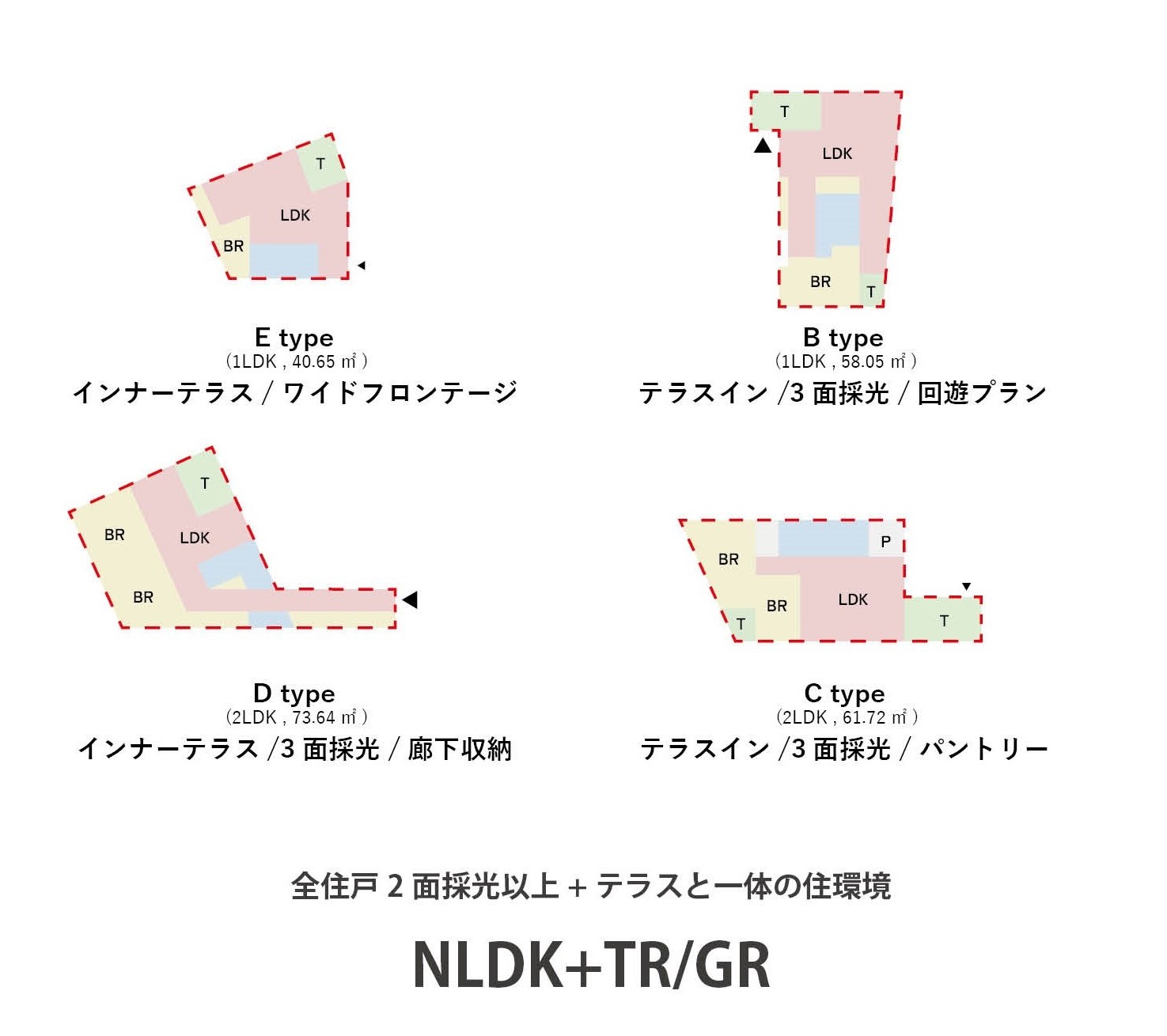 広い屋根付きテラス、テラスを居室化したサンルームのような部屋、壁で囲われた落ち着いた部屋、テラスイン住戸など、キャラクターのある空間が組み合わさった住環境となっています。住環境の多様さが、ここにしかない彩り豊かな暮らしを実現します。