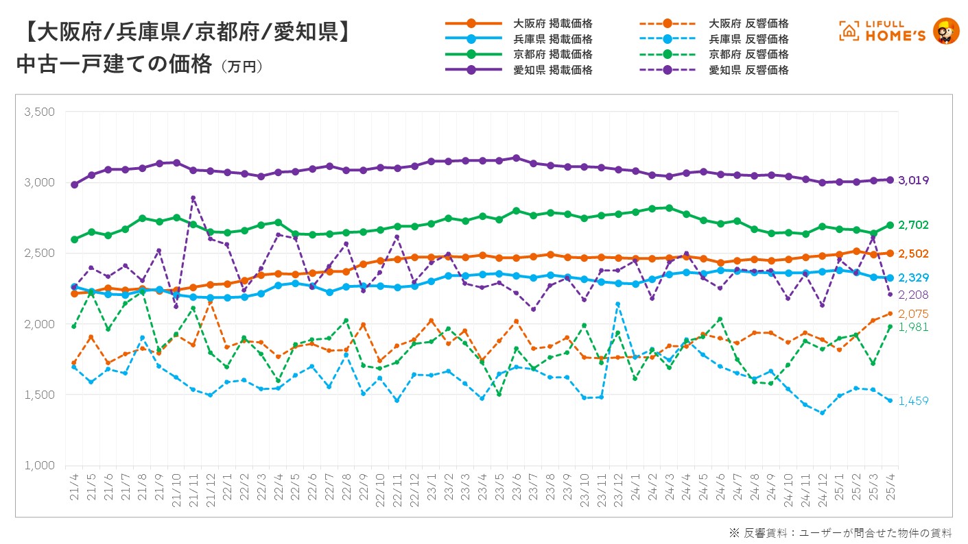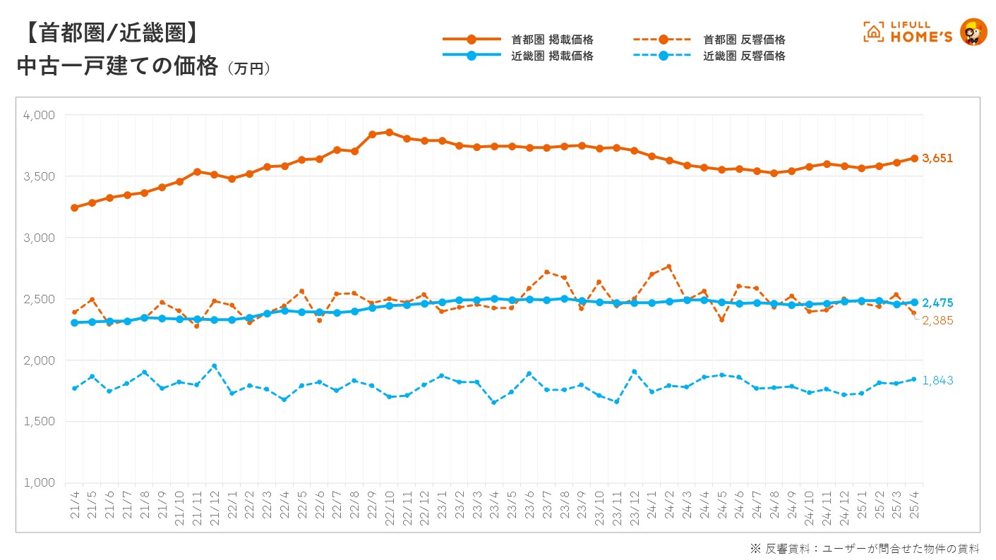中古一戸建ての平均掲載価格は、首都圏(東京都、神奈川県、埼玉県、千葉県)が3,651万円(前年同月比102.2%)で2023年9月以来20ヶ月ぶりに2ヶ月連続で前年同月を上回りました。一方、近畿圏(大阪府、兵庫県、京都府)は2,475万円(前年同月比99.3%)と、20ヶ月にわたって2,400万円台後半で安定推移しています。