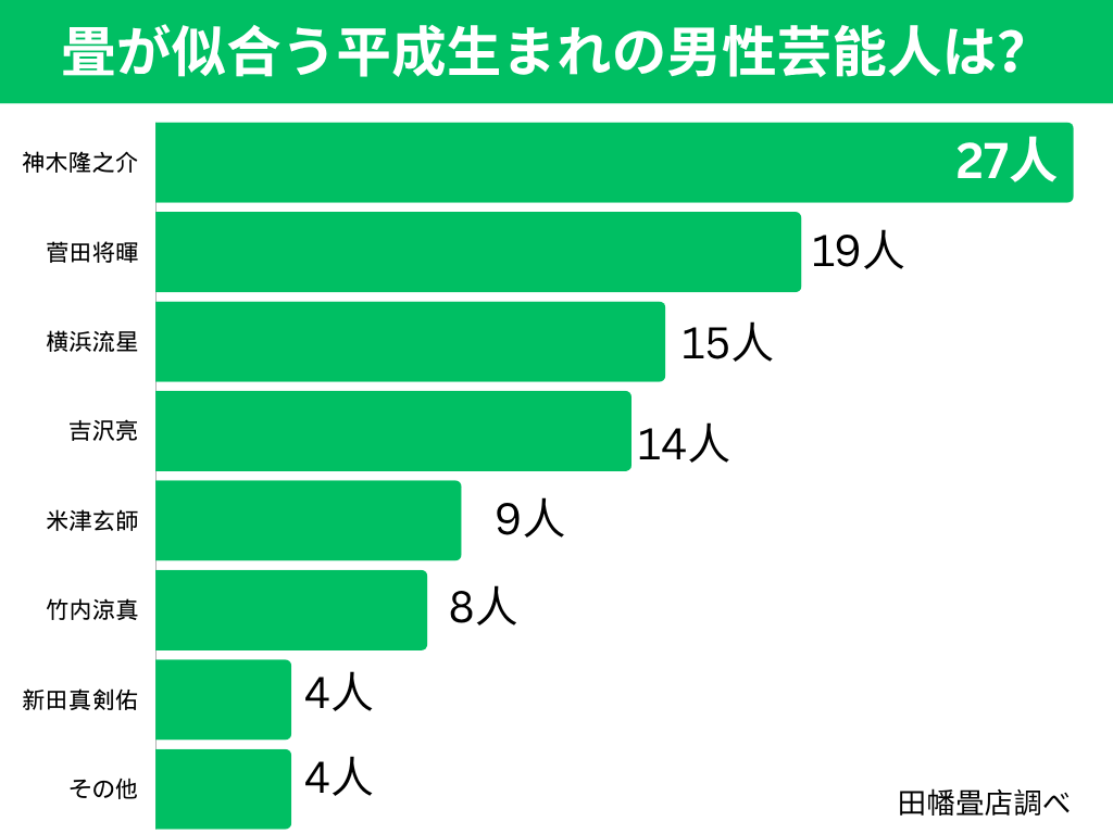 「畳が似合う平成生まれの男性芸能人は?」と質問したところ、「神木隆之介さん」が27人、「菅田将暉さん」が19人、「横浜流星さん」が14人、「米津玄師さん」が9人という回答になりました。