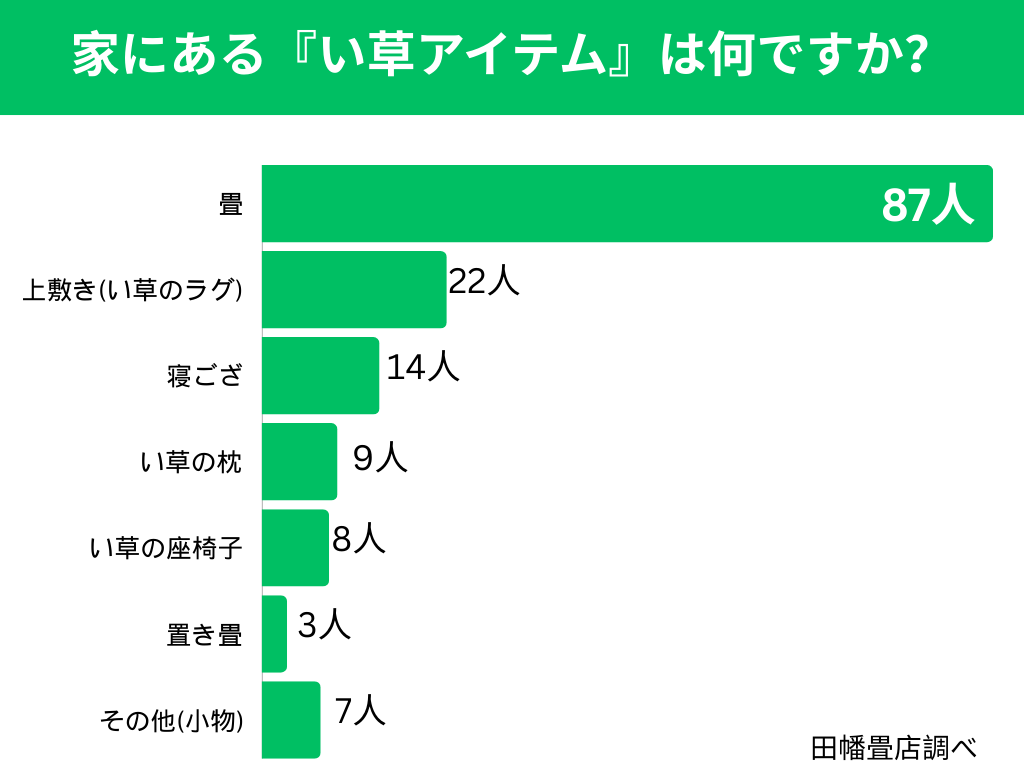 「家にあるい草アイテムは何ですか?(複数回答可)」と質問したところ、「畳」が87人で最多、次に「上敷き」が22人、「寝ござ」が14人という回答になりました。