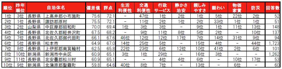 街の住みここちランキング2025<甲信越版>自治体TOP10・因子別順位