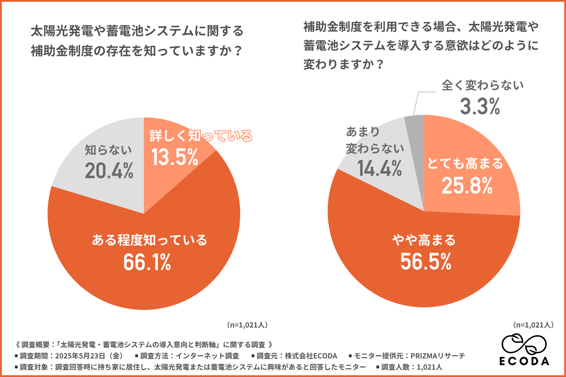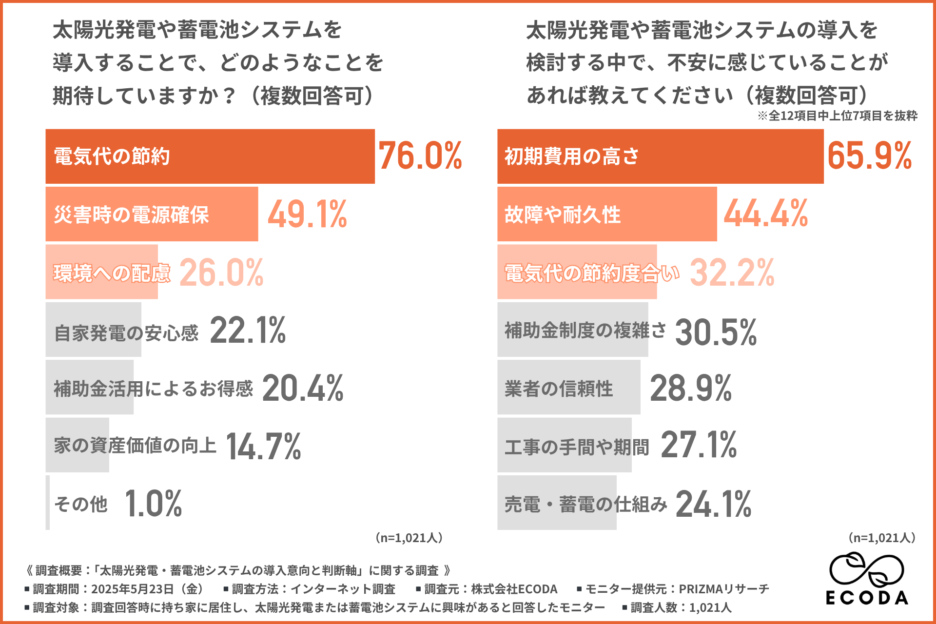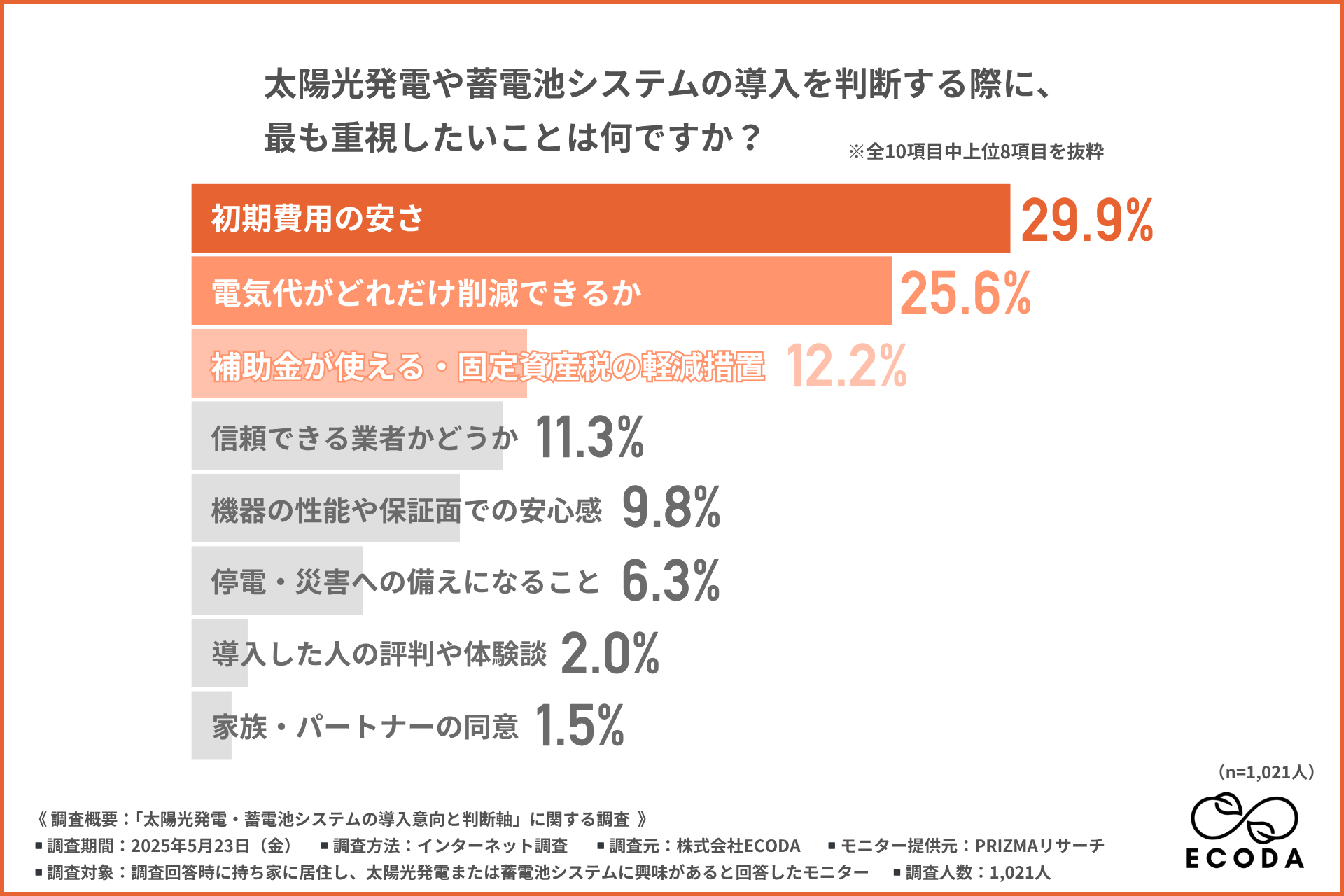株式会社ECODA(本社:東京都渋谷区、https://ecoda-corp.com/ )は、持ち家に居住し、太陽光発電または蓄電池システムに興味がある方を対象に、「太陽光発電・蓄電池システムの導入意向と判断軸」に関する調査を行いました。