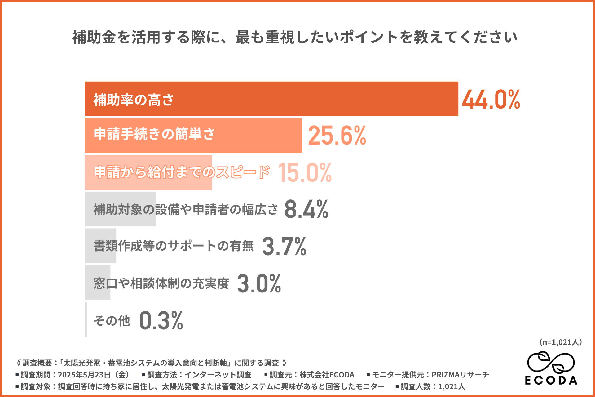 しかしながら、制度の利用によって約8割が導入意欲に影響を受けると回答しており、「補助率の高さ」「申請の簡便さ」「給付のスピード」が重視される傾向にあることがわかりました。