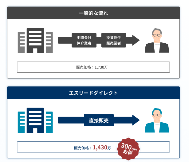 「エスリードダイレクト」は、エスリードグループが自社開発した投資用中古ワンルームマンションを、仲介業者を介さずに、直販価格で購入できる新しいサービスです。市場に出回る前の優良物件を、3週間限定で会員向けに先行公開し、履歴情報の開示やグループ一貫のサポート体制により、透明性と安心感を兼ね備えた資産形成を支援します。
