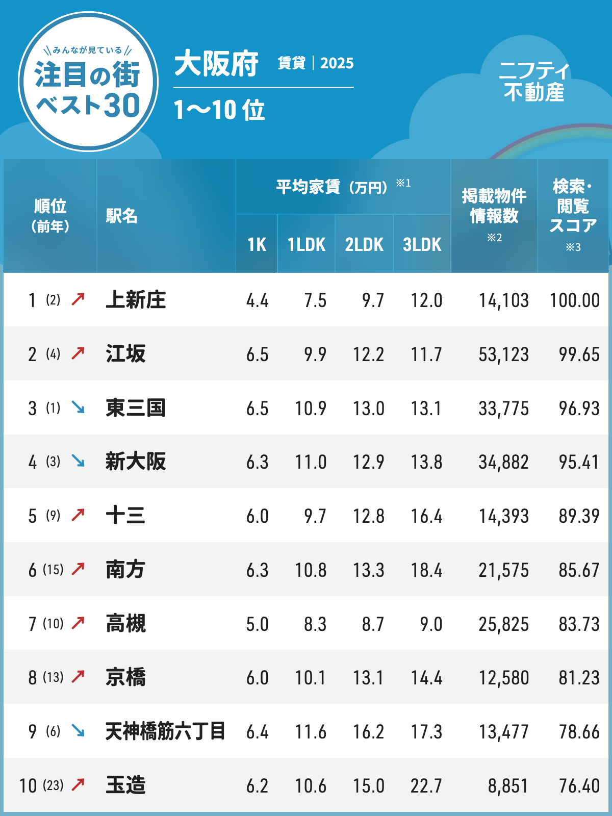 「大阪の賃貸物件探しで注目の街ランキングベスト30」を発表(2025年調査)【ニフティ不動産】