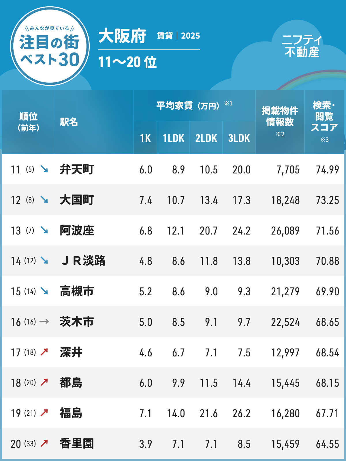注目の街ランキングベスト30 大阪府2025 11~20位