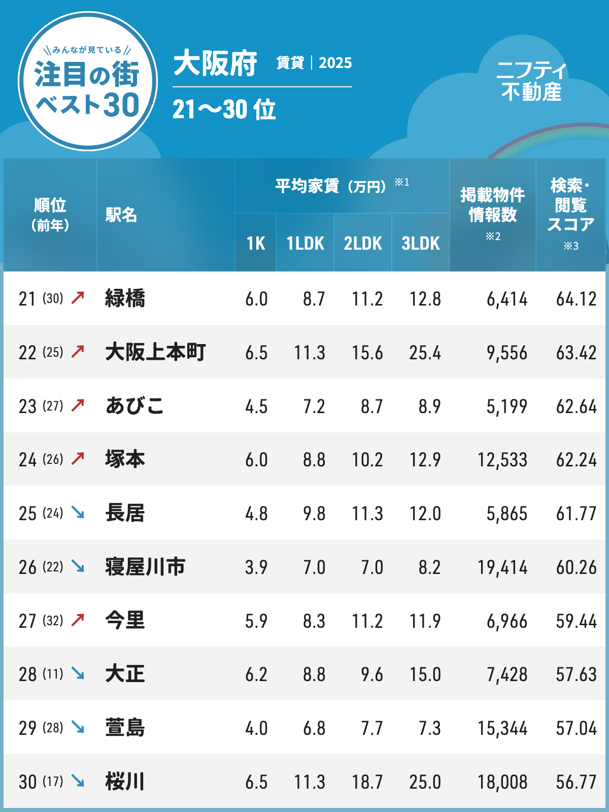ホーム調査レポート「大阪の賃貸物件探しで注目の街ランキングベスト30」を発表(2025年調査)【ニフティ不動産】