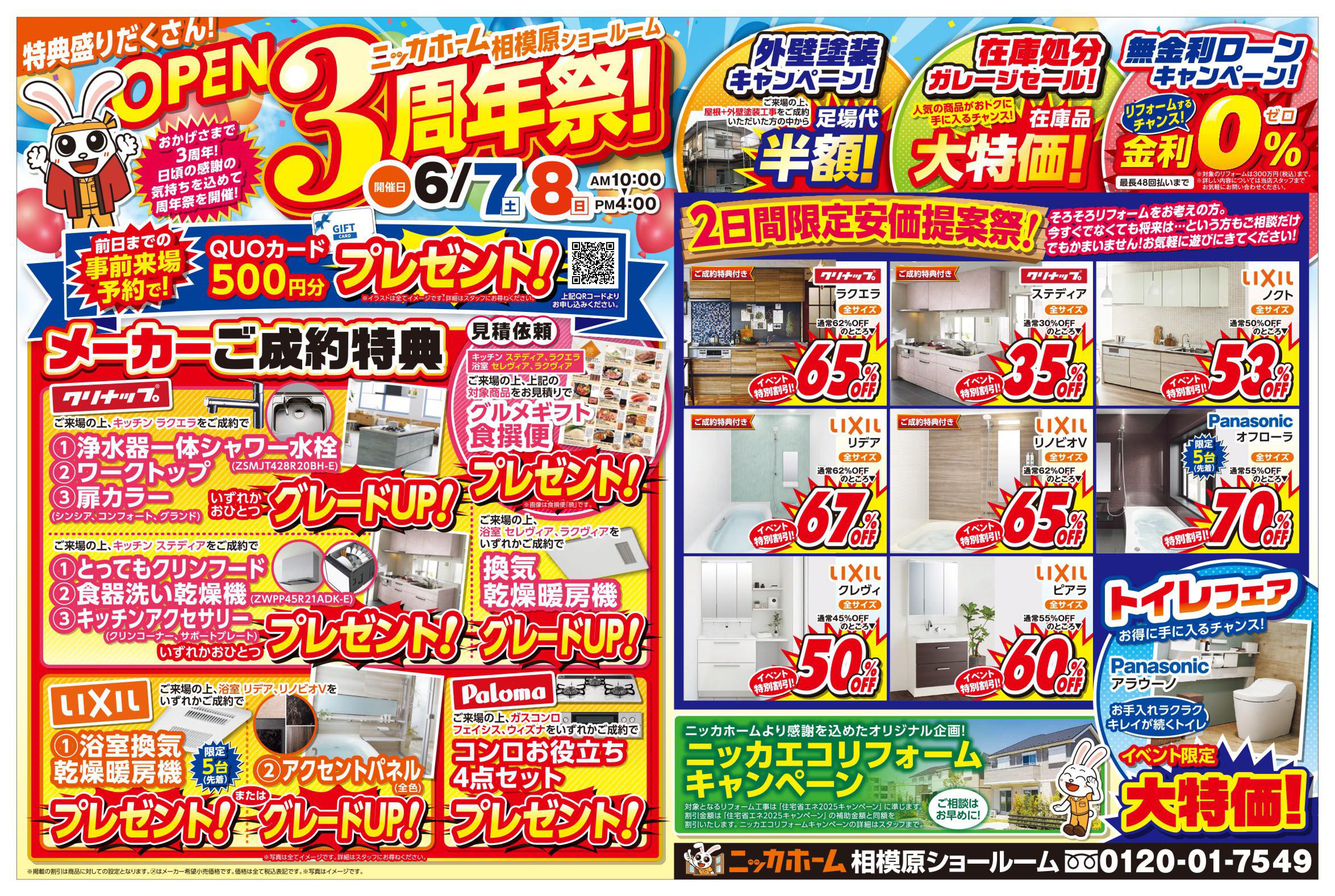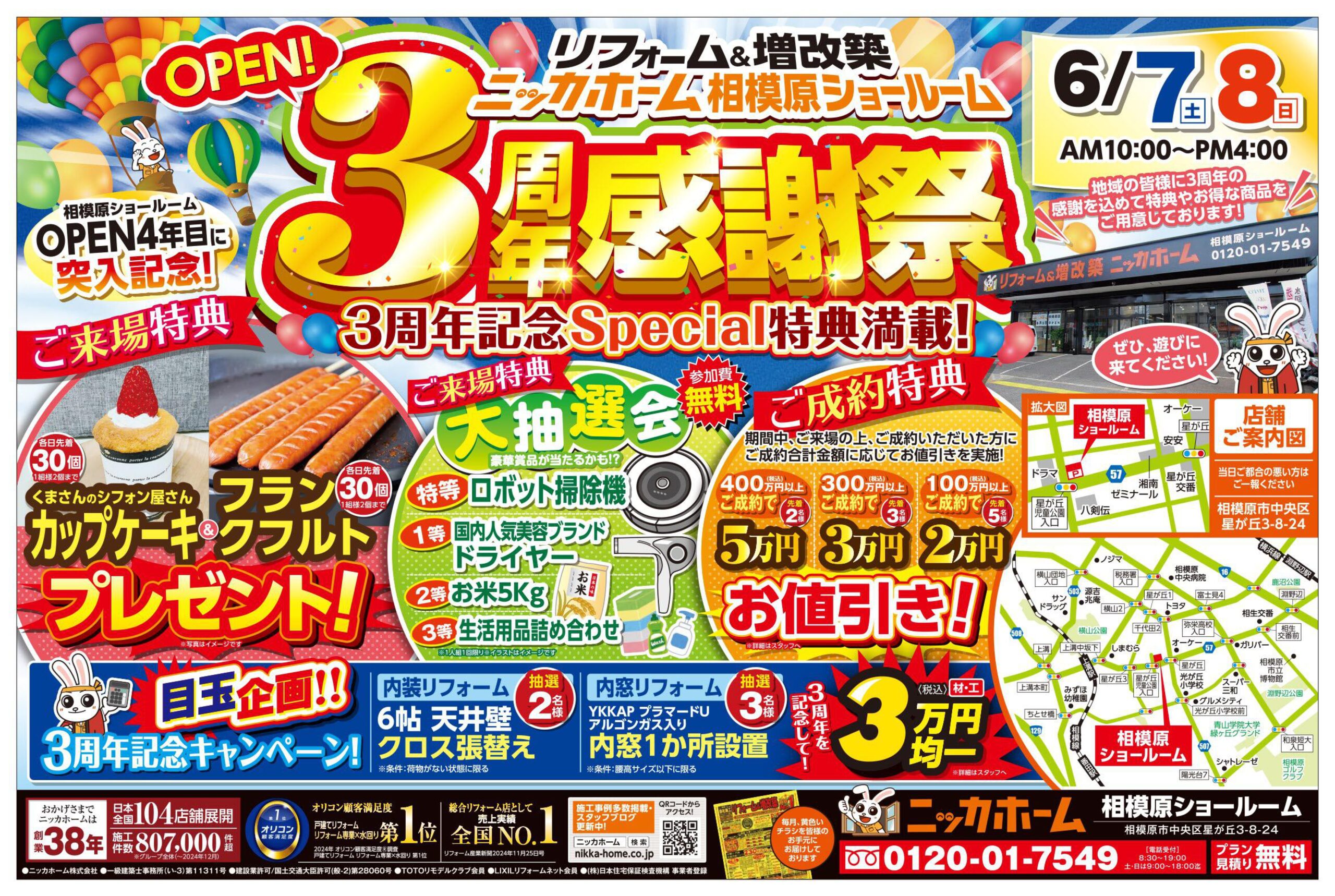 ニッカホーム相模原ショールームオープン3周年を記念した”感謝祭”が、6月7日㈯・8日㈰の2日間限定開催!