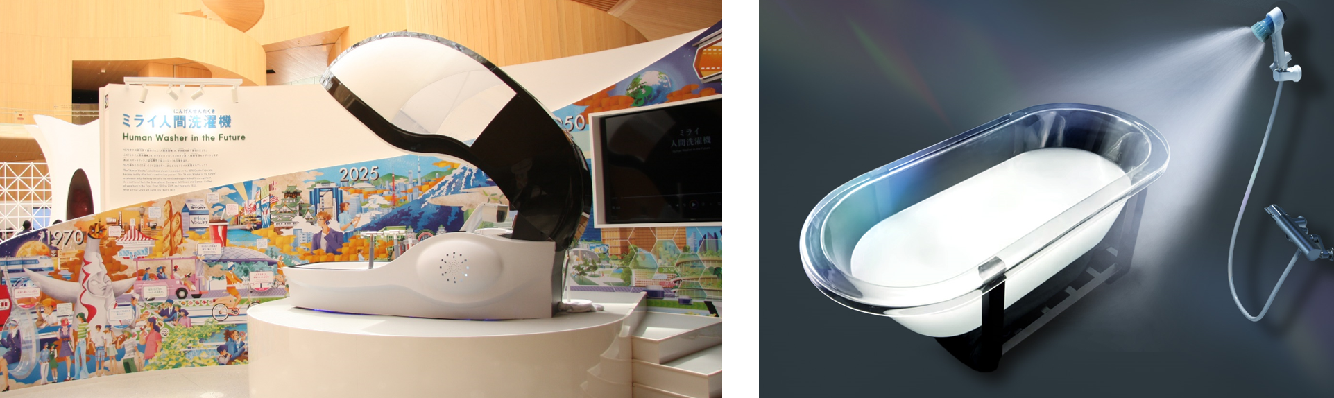 2025年大阪・関西万博の大阪ヘルスケアパビリオンに出展中の「ミライ人間洗濯機」は「カラダもココロも自動で洗われる時代へー」をコンセプトとしています。カラダを洗う部分では、ミラブルテクノロジーが活用されており、また、身をゆだねているだけで背面のセンサーを使用して入浴者の心電図をモニタリングし、よりリラックスやリフレッシュができる空間を演出。ミライの浴室環境における新習慣を提案しています。